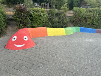 Auch unser bekannter "Rudi Regenbogen" auf dem Schulhof, wurde dank einer Künstlerin aus Bad Vilbel und der Hilfe einiger Kinder für die baldige Sanierung vorbereitet .